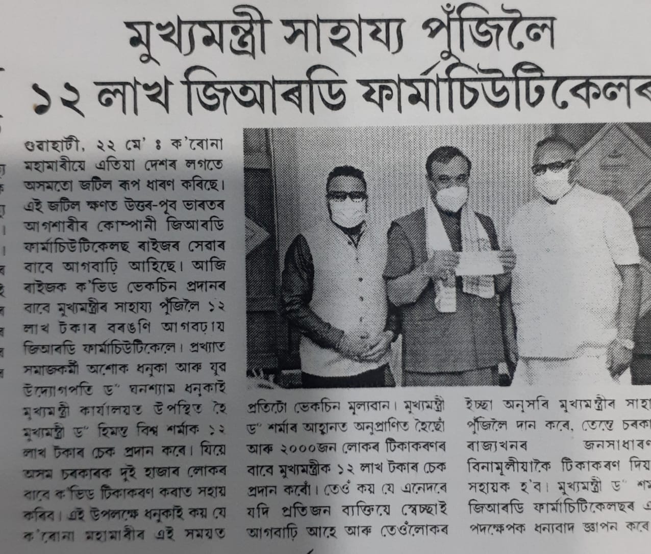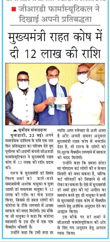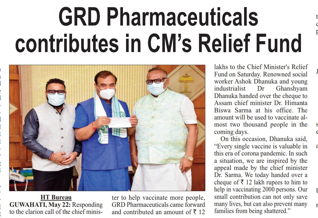 GRD PHARMACEUTICALS CONTRIBUTES IN CM RELIEF FUND